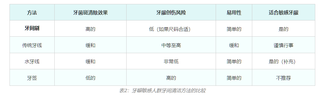 牙间刷在清除牙菌斑方面始终优于传统牙线,而且对牙龈的损伤风险更低。水牙线是一种有益的辅助工具——尤其是在刷牙后冲洗——但不应取代机械式的牙间清洁。